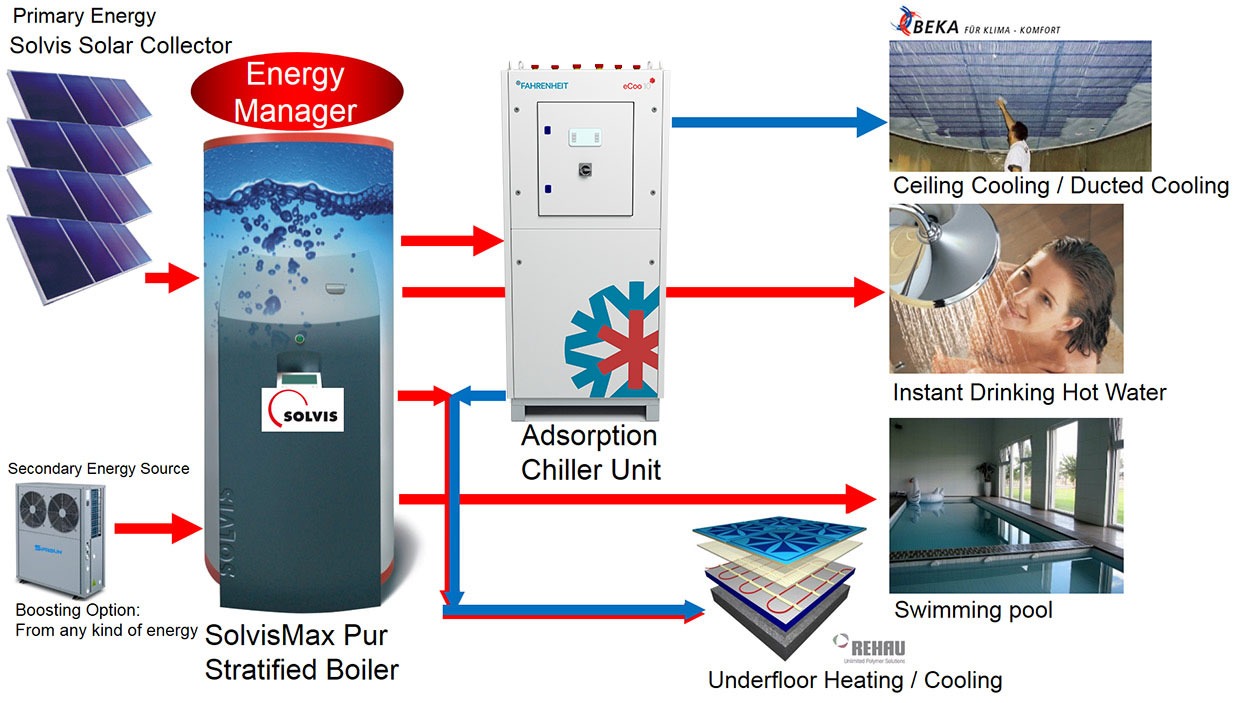 Use a modular solar hydronic heating system in conjunction with a Fahrenheit adsorption chiller to get free cooling.