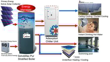 By means of the hot-water circuit (driving circuit), thermal energy is being supplied to power the Adsorption Chiller Aggregates and the heat exchange that happens inside of it.